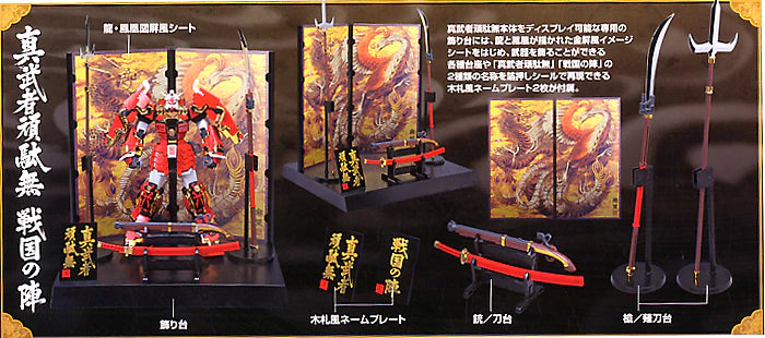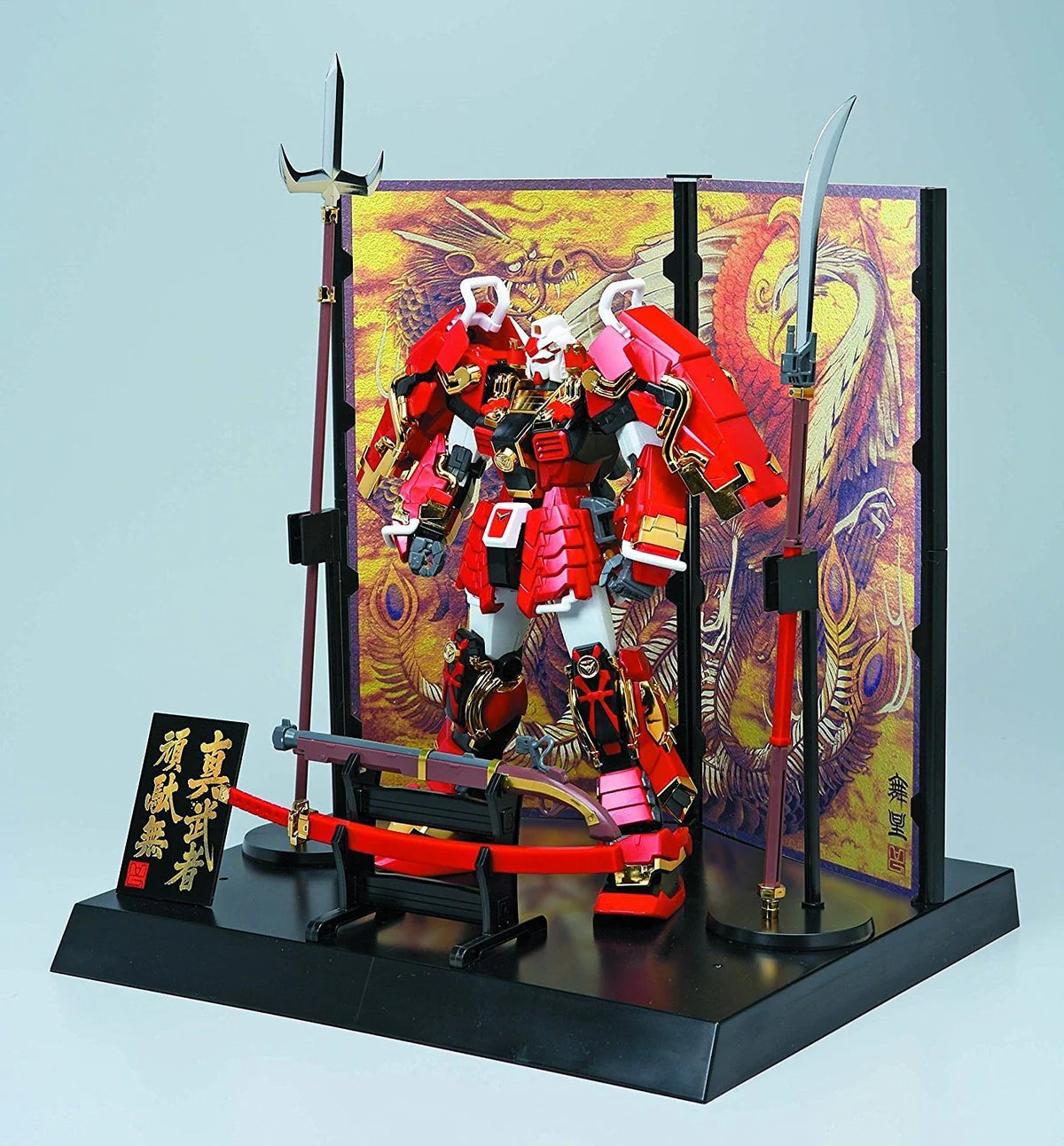 This deluxe "Sengoku no Jin" box set packs the previously released MG Shin Musha Gundam MG kit, this time molded in gloss colors and shiny gold plating, together with brand new accessories including a gorgeously illustrated folding screen, dedicated stands for each weapon, and a custom base to create an eye-catching presentation resembling a traditional Boys' Day samurai doll display!